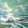 Here is a painting depicting a seascape. In the foreground, the waves are raging, foaming from the fresh sea breeze. The light of the sun, barely peeking out from behind the clouds, scatters across the water in golden glare, adding a special picturesqueness to the turbulence of the sea surface. Seagulls are soaring high in the sky, creating a feeling of lightness and space. The palette of the painting is maintained in gentle greenish-blue tones, which gives the image of the sea an almost fairy-tale, dreamy atmosphere. This work is filled with life, energy and peace, as if inviting the viewer to plunge into the coolness of the sea waves and breathe in the salty sea air.