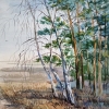 This is a watercolor painting depicting a corner of a quiet forest. In the foreground, you can see several birch trees with white, slender trunks, slightly tilted to the side. Their thin branches are almost devoid of leaves—perhaps it is early spring or late autumn. Behind the birches, there is a group of tall pine trees with thick green crowns, whose trunks go up. Dry grass grows under the trees, and here and there the green of young shoots breaks through. In the background, the blurred outlines of a field and a grove appear, and the sky is painted in light blue shades. Several birds are hovering in the air, adding a sense of space and peace to the painting. The artist skillfully conveys the soft light, freshness and tranquility of nature, reminding the viewer of the beauty of familiar, but so familiar landscapes.
