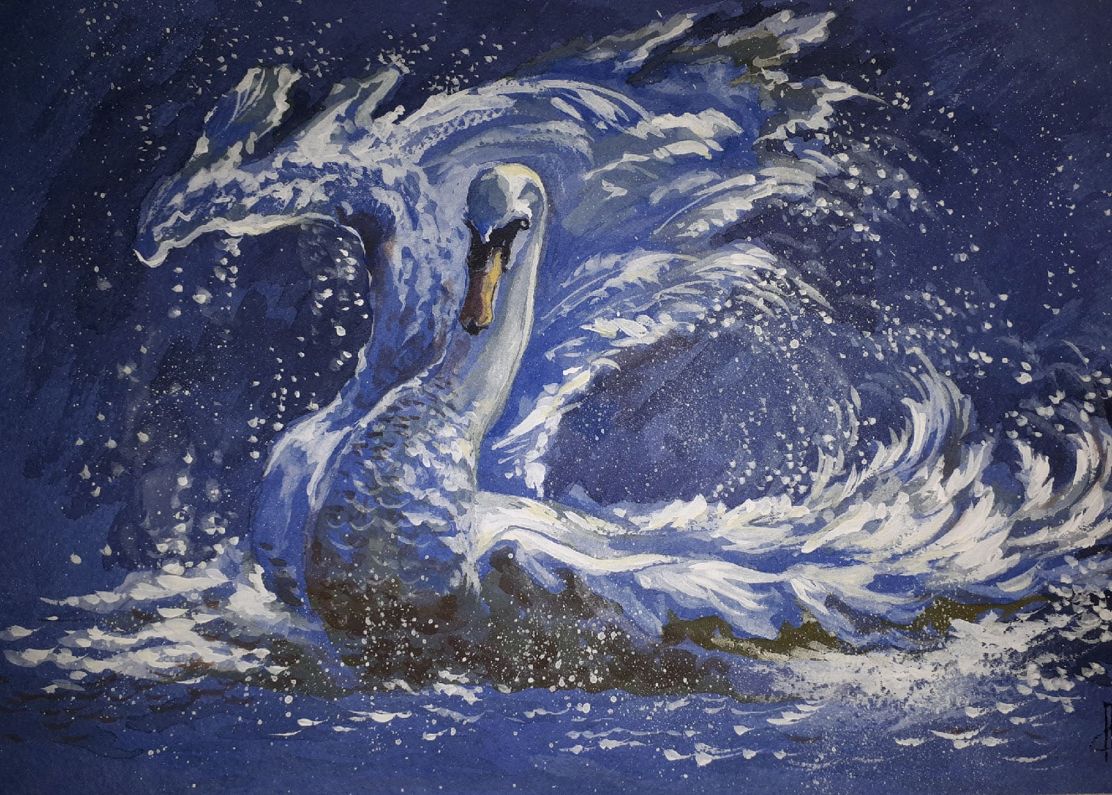 The painting depicts a majestic swan rising from the water, surrounded by seething streams of spray. The main range of the painting is rich blue and white shades, creating a feeling of night coolness and at the same time movement, the energy of nature. The wings of the swan seem to merge with the waves, forming a beautiful, almost magical pattern of water and foam. Masterfully painted details create the effect of lively dynamics, as if the painting captured the moment of flight and freedom. This work is filled with grace, strength and mystery of the water element, emphasizing both the elegance and power of this beautiful bird.