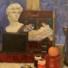 This painting presents an expressive still life filled with objects related to the artist's work. In the center of the composition is a bust reminiscent of an antique work, symbolizing the connection with classical art. Behind it is a reproduction of a painting by Edouard Manet, which emphasizes the continuity of artistic traditions.