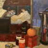 On the table you can see jars of paint, brushes, a palette, a box of matches, an orange, a metal jug - all those details that surround the artist in the process of work. These objects create an atmosphere of a studio, saturated with inspiration and creative search.