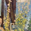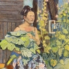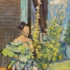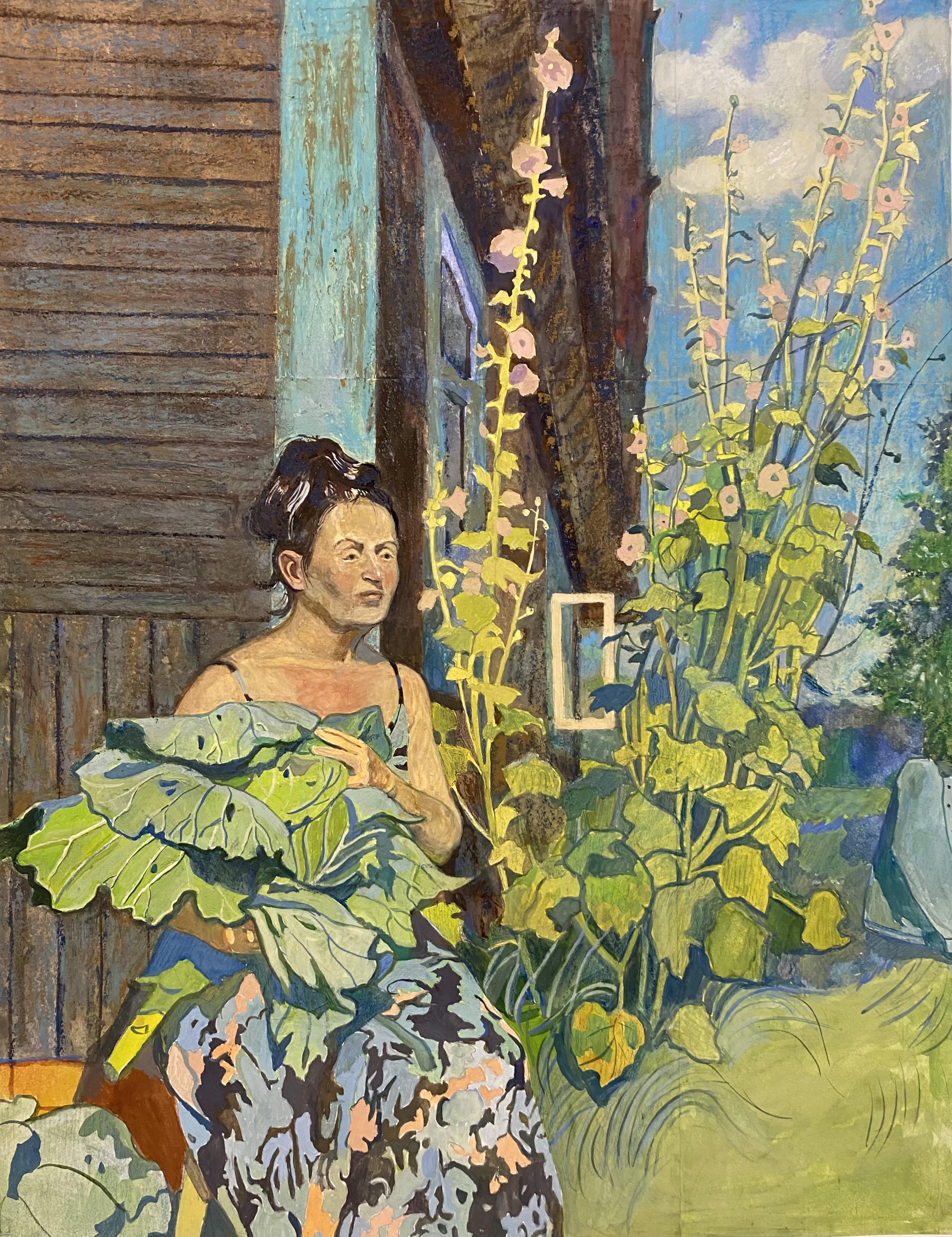 The painting depicts a woman sitting by an old wooden house against the backdrop of blooming mallows and a bright summer sky. Her appearance is permeated with calm and thoughtfulness, her hands tightly holding large green leaves, perhaps just picked from the garden. The freshness and massiveness of the green leaves emphasize her connection with nature and the earth.