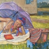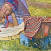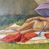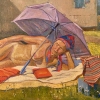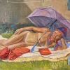 The painting depicts a sunny summer day, filled with an atmosphere of carefree relaxation and comfort. In the center of the composition lies a naked middle-aged woman. She is relaxed on a large light blanket right on the grass near the house. The woman is protected from the sun by a large purple umbrella, on her head she has a colorful scarf, which gives the image warmth and rustic simplicity.