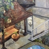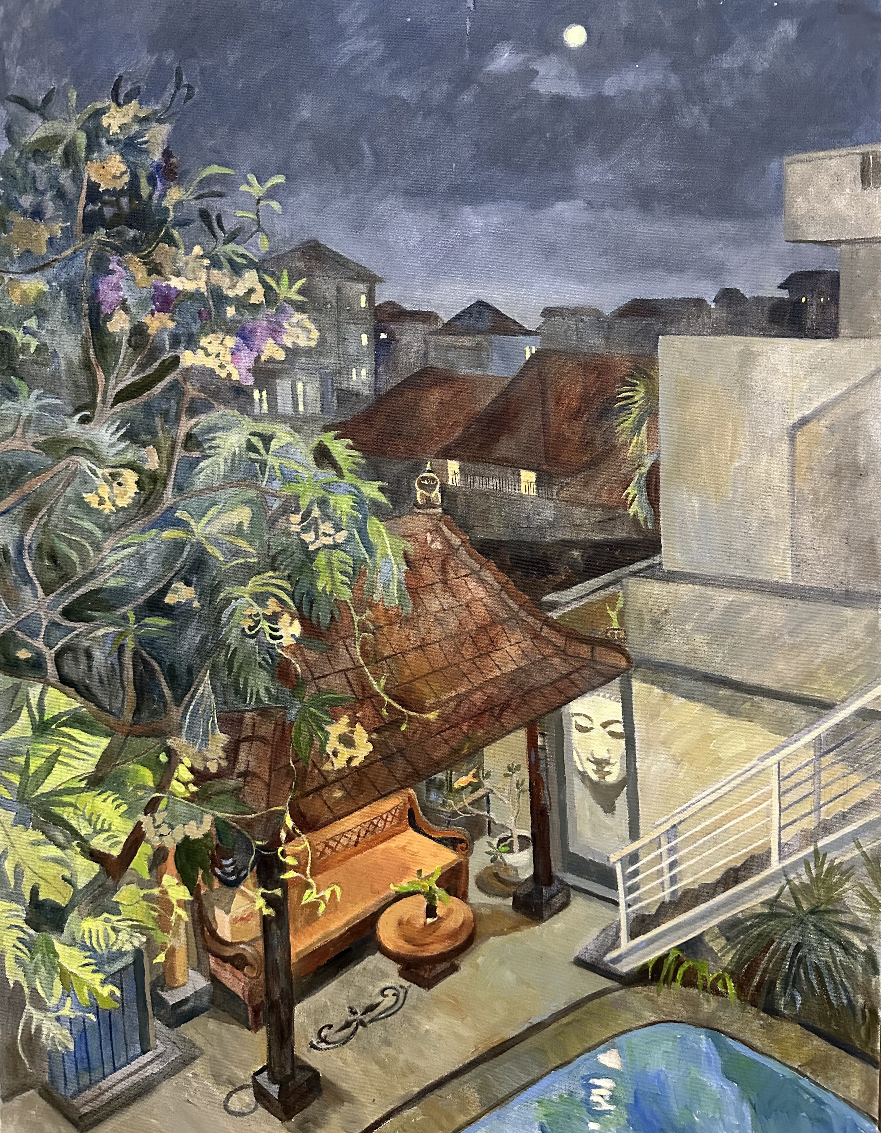 This is my second large canvas created in Bali. This is a continuation of my Balinese period. The painting depicts the villa where I have been living for the second month. This night interior seemed unusual and very cozy to me. I chose the angle, the view from the second floor. I put up an easel, paints and started creating. I rarely depict night. On the contrary, I often paint during the day or in the sun. Therefore, it was a real discovery for me what an unusual flavor and color the objects have at night. The first floor of the villa is well lit, so the light falls on all the surrounding objects.