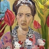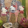 In front of the heroine is a row of funny Hello Kitty figurines, each decorated in its own way, which symbolizes a game with childhood memories, pop art culture and irony. On the table you can see exotic fruits and a shell with a pearl, creating an atmosphere of mystery and a kind of still life portrait.