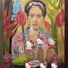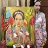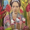 Around the woman are large exotic flowers of rich red and yellow shades, picturesquely filling the space around the head and giving the portrait a feeling of an inner garden or a tropical oasis. In the background in the upper left corner, you can see a blue Buddha statue, adding an oriental motif and a hint of spiritual quests.