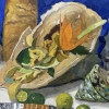 In the background, bread products are noticeable - baguettes and pastries with curls, which look organically among the shells, creating a contrast between the world of marine nature and the fertility of the earth. Painterly elements, such as tubes of paint, emphasize the presence of the artist, his gaze and intervention in this scene. All this is framed by a rich blue background, which enhances the contrast and depth of the image, creating the effect of a calm marine space.