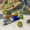 This painting is an unusual still life that combines natural elements and attributes of creativity. In the foreground are sea shells of different shapes and textures, creating a sense of the connection between the earthly and marine worlds. Alongside them are fresh sea urchins, opened to reveal their inner beauty, and small limes, adding brightness to the composition.