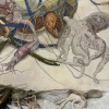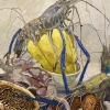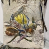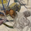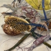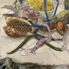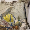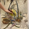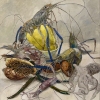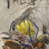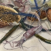 This painting is a delicate still life where marine life and flora intertwine to create an exotic and dynamic composition. The foreground features shrimp, squid and other sea creatures with graceful lines of long antennae and tentacles that add a sense of movement to the image. Their color palette ranges from pale blues and grays to rich greens and purples, highlighting the richness of the sea life.