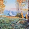 The painting depicts a picturesque autumn landscape. In the foreground, golden and silver birch trees gracefully rise above soft green grass strewn with flowers. A path, engulfed in the warm light of early morning, leads the eye to a calm river meandering among growing hills. Autumn forests in the distance glow with yellow and orange hues, smoothly turning into blurred horizons. The atmosphere is filled with a sense of calm, harmony and slight nostalgia. The painting perfectly conveys the delicate beauty of nature during the golden autumn period.