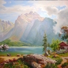 A copy of a painting by A.V. Leu. The painting depicts a lake in the Alpine mountains. A quiet, cozy spot. The painting is done in oil on canvas and covered with varnish.