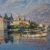 The painting depicts a cozy seaside town surrounded by mountains and reflected in calm water. In the foreground are boats rocking on the calm surface, making their reflections seem almost mirror-like. The bright tiled roofs of the houses, the old buildings and the church bell tower create an atmosphere of Mediterranean coziness. The mountains in the background complement the composition with their soft, warm shades, emphasizing the beauty of nature and architecture. The painting conveys a sense of peace, harmony and serenity of seaside life.