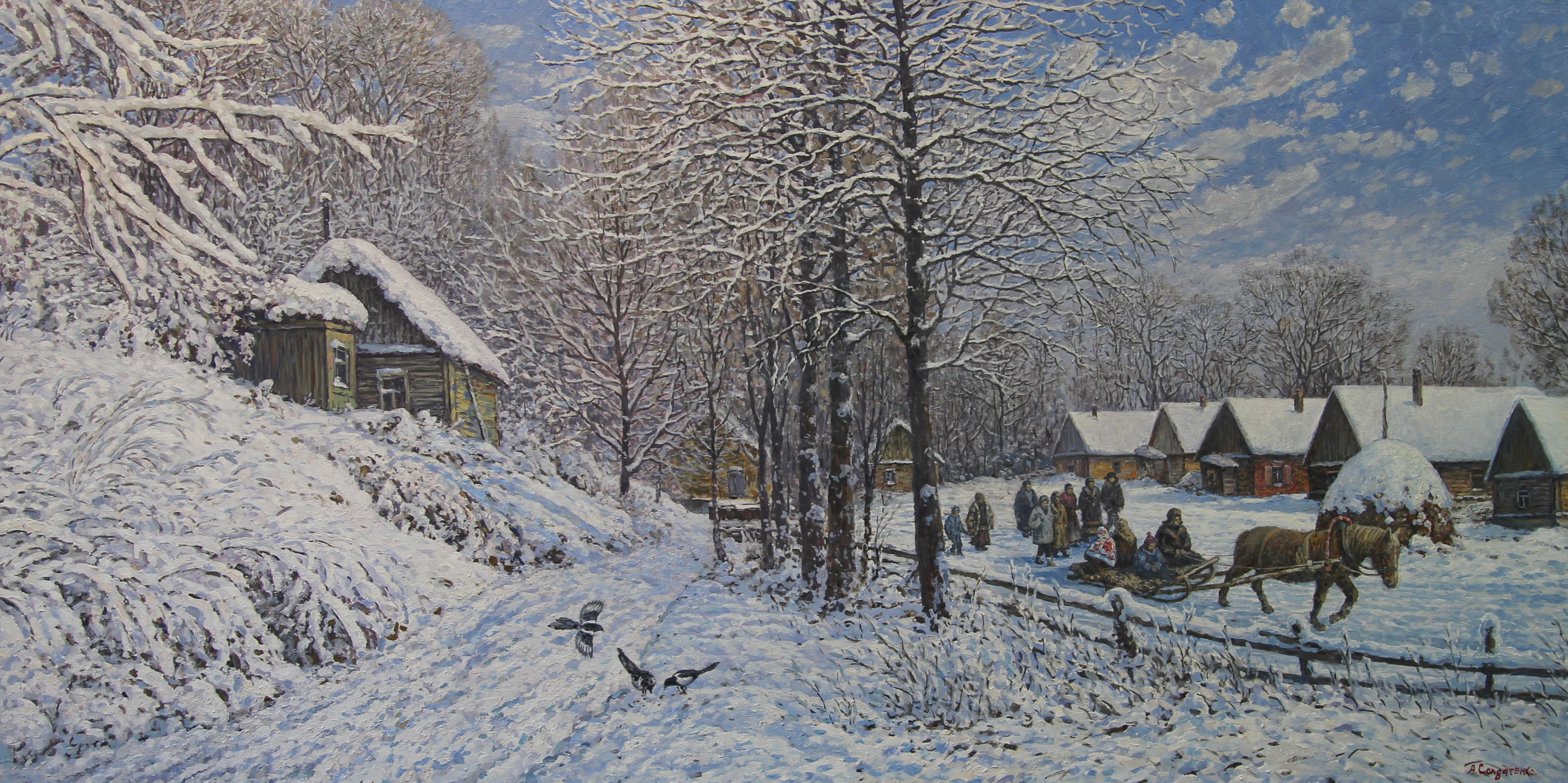 This original artwork "Winter day in the village" was created by the contemporary Russian artist Andrey Soldatenko and is available for sale online.