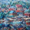 The painting depicts a cozy corner of a small town by the water. Bright houses with tiled roofs are located in a cascade on the slope, creating a picturesque composition. Their warm colors echo the rich palette of boats and motorboats moored at the shore. Buildings, trees and ships are reflected in the calm water, which adds depth and dynamics to the picture. The foliage of the trees frames the urban landscape, gradually turning into wooded hills. The work is done in a style close to cubism, which adds generality to the form, turning each detail into a bright and expressive accent. The painting conveys a festive and cheerful mood.