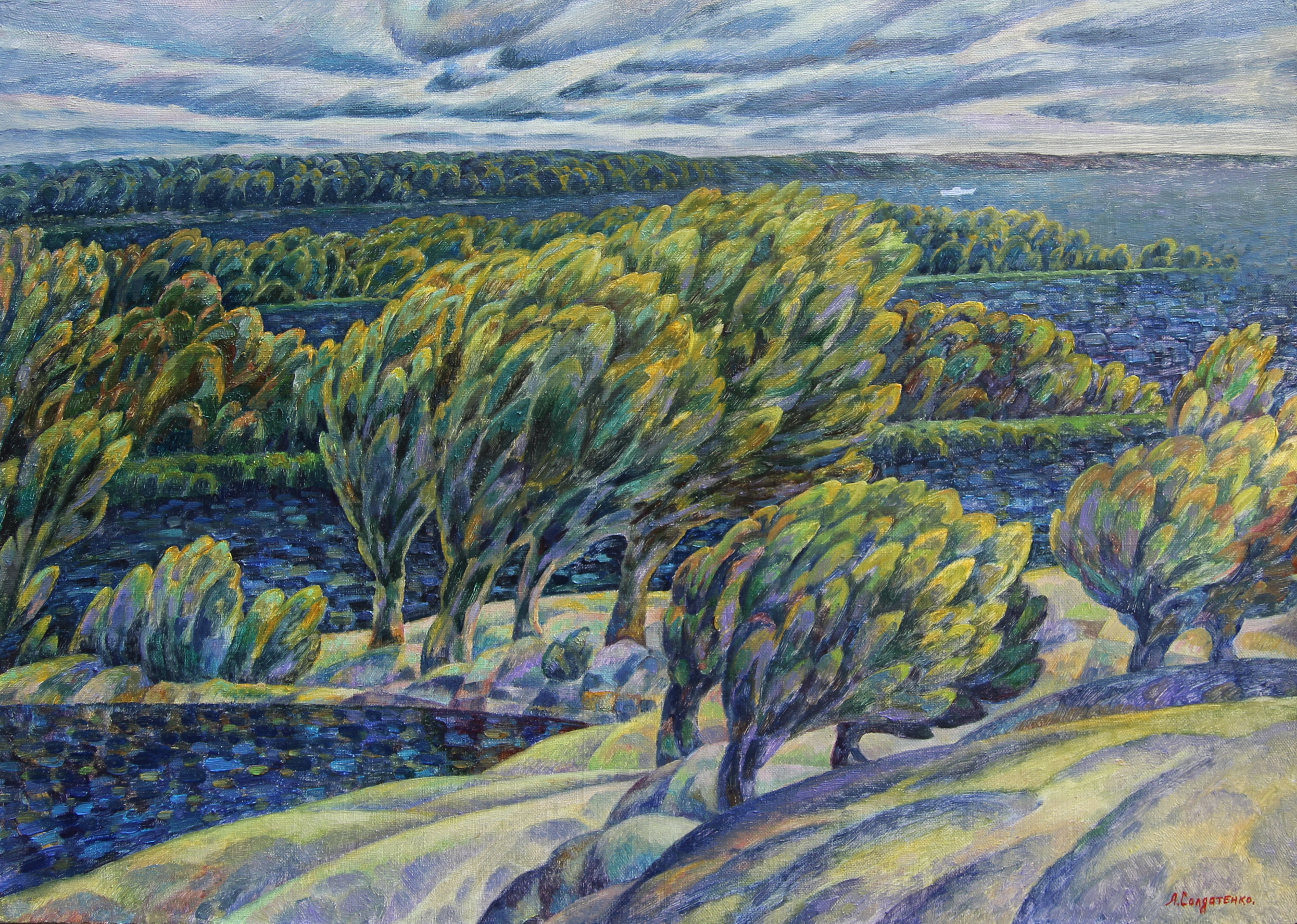 This original artwork "Windy day on the Volga islands" was created by the contemporary Russian artist Andrey Soldatenko and is available for sale online.