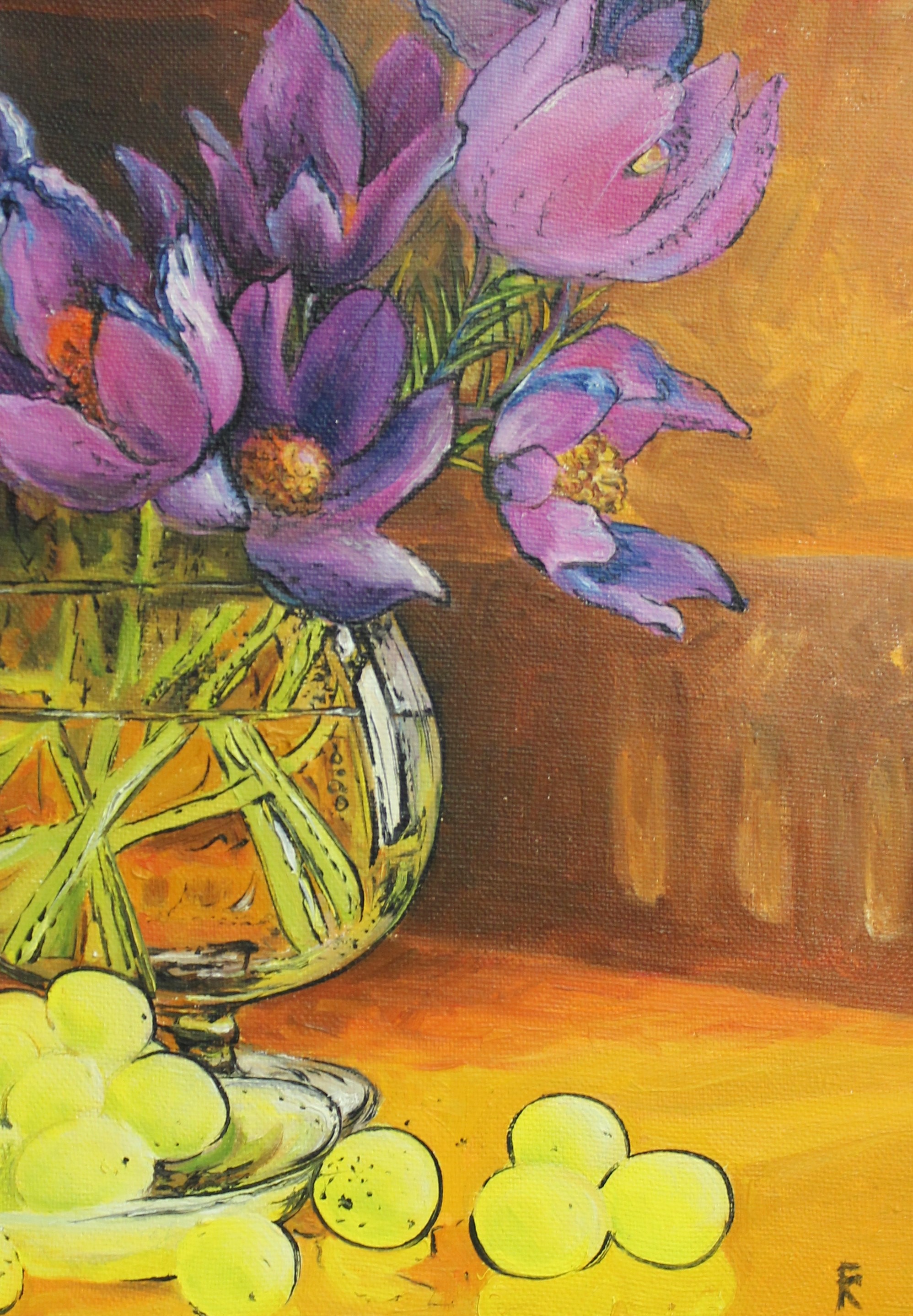 A still life of snowdrop flowers and grapes, unexpectedly, the combination looks very harmonious, complementing all the elements of the painting.
