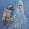 On the canvas, we see a wise elder with a long white beard and a penetrating gaze, holding in his hand a symbol resembling a rune. Behind his shoulder, like a guardian angel, stands a creature combining features of a woman and a bird. A halo shines above the elder’s head, emphasizing his holiness and divine essence. The background of the painting, executed in cold blue and синие tones, creates a sense of space and mystery.