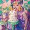 On the canvas, we see a little girl in a fancy dress and a hat with flowers, standing in front of a tall birthday cake. The girl eagerly reaches for the cake with her tongue, expressing her joy and delight. Next to the cake, we see jars of sweets and jam, which enhances the feeling of celebration and sweetness. The background of the painting, executed in bright and pastel tones, creates a feeling of lightness, airiness, and a festive mood.