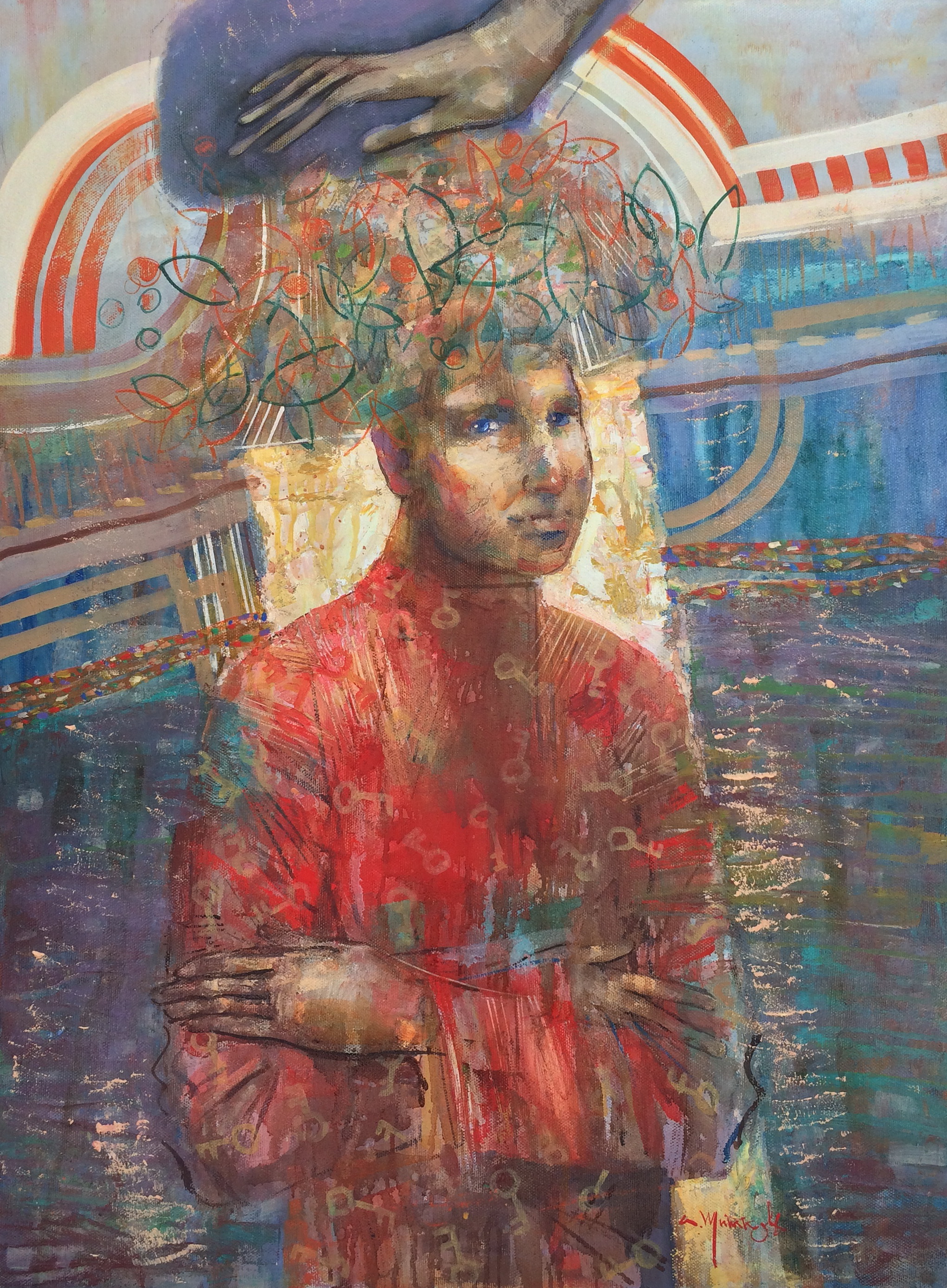 On the canvas, we see a figure of a person, dressed in a red shirt, standing surrounded by complex geometric shapes and symbolic elements. Above the figure’s head are hands, as if reaching out from heaven for a blessing, and a rainbow, symbolizing the connection between God and man. The background of the painting is made in cold, blue, and green tones, which creates a sense of depth and mystery.