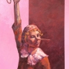 On the canvas, we see a figure resembling Pinocchio, with a long nose, holding up an arm with a large golden key. The figure’s clothing hints at the costume of the fairytale hero, but at the same time, it lacks specific details, which allows the viewer to imagine the image for themselves. The background of the painting is divided into two parts: one pink, the other dark red, creating a dramatic contrast and emphasizing the tension of the composition.