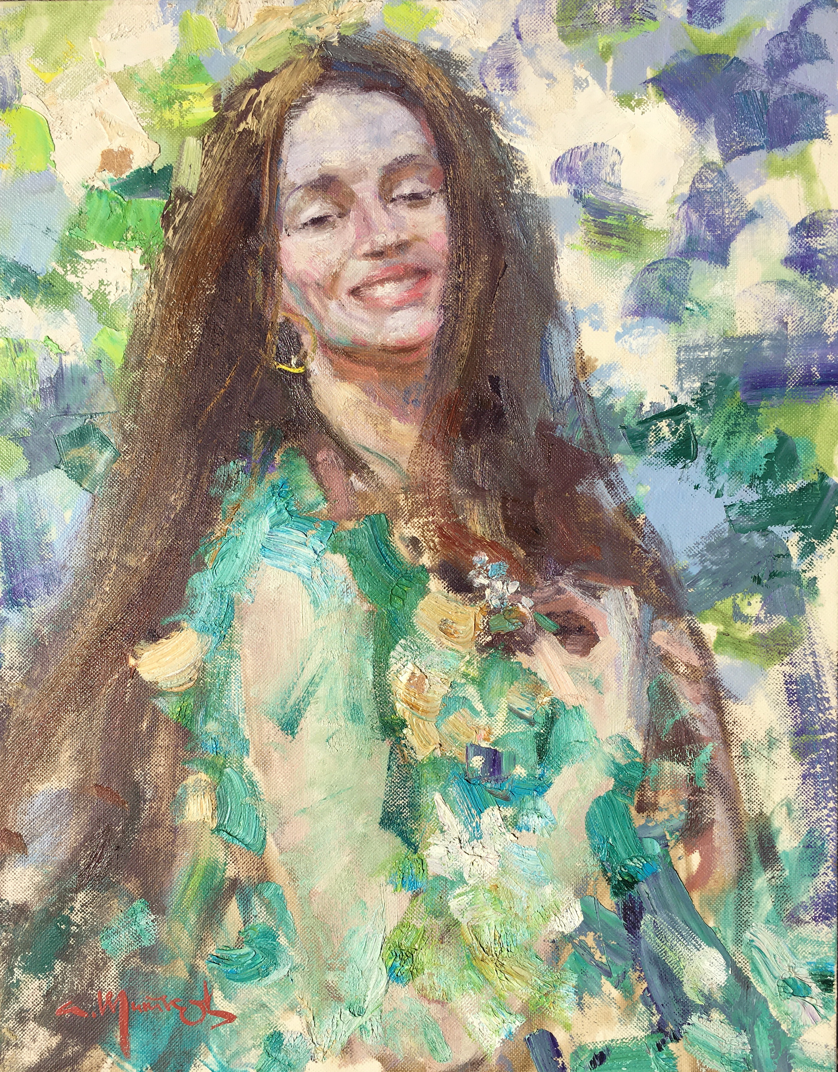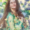 On the canvas, we see a young woman with long, flowing hair, dressed in a light green dress. Her face, painted with broad, free brushstrokes, radiates happiness and serenity. A broad smile directed at the viewer and shining eyes convey joy and energy. The background of the painting, done in bright, summery tones, creates the feeling of a sunny day.