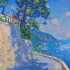On the canvas, we see a winding road meandering along the coast. On one side it is bordered by a stone wall, on the other - a breathtaking view of the sea, rocks, and verdant hills opens up. Sunlight floods the landscape, making the colors bright and saturated. Tall pines and other trees growing along the road create a sense of shade and coolness.