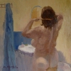 In the painting, we see a woman standing in front of a mirror and combing her hair. She is immersed in her thoughts, in her feelings, and seems not to notice the presence of the viewer. The interior of the bathroom, made in muted, warm tones, creates an atmosphere of comfort and tranquility.