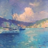 On the canvas, we see a bay illuminated by the first rays of the morning sun. Small yachts, peacefully swaying on the waves, create an atmosphere of calm and serenity. In the distance, hills are visible, shrouded in a light haze, which gives the landscape depth and perspective. The sky, shimmering with shades of blue and lilac, seems to herald a clear and warm day.