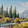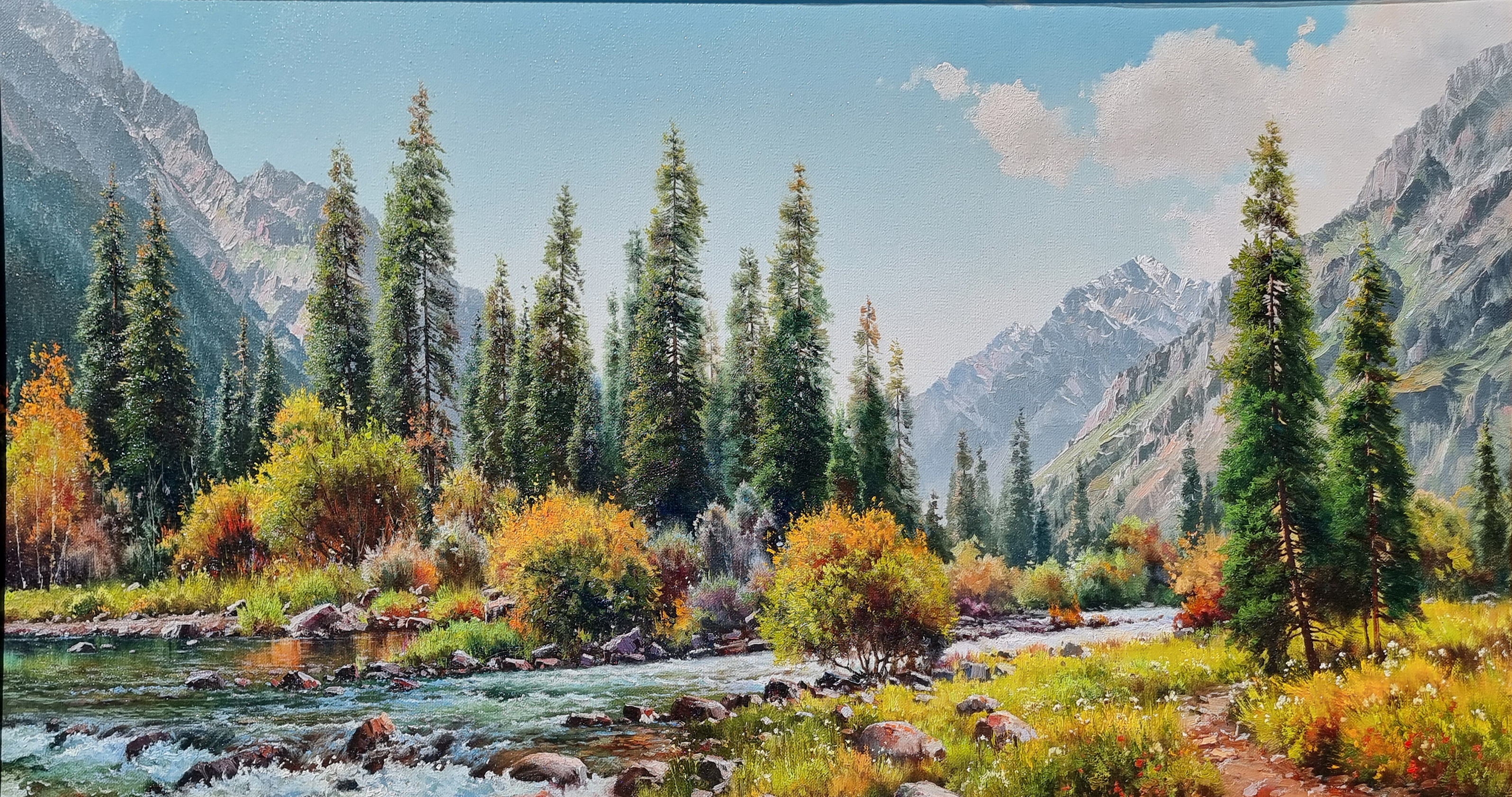The painting depicts a picturesque mountain landscape. A clear mountain stream flows through tall, slender firs and lush bushes, creating an atmosphere of tranquility. The water reflects sunlight, shimmering in different shades of blue and green. Majestic mountains with snow-capped peaks rise in the distance, emphasizing the depth and spaciousness of the composition. Bright autumn colors of foliage combine with rich green shades of coniferous trees, giving the landscape liveliness and harmony. The sky is clear, with light clouds, creating a feeling of freshness and freedom. The painting conveys the grandeur of nature and invites the viewer to immerse themselves in its tranquility and beauty.