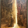 The painting depicts a figure in a long robe standing on a threshold between two massive walls.. In the center of the composition is a bright vertical strip of light, dividing the space in half, as if opening a path or offering a choice. The figure stands facing the light, full of anticipation, perhaps hope or determination, as if ready to take a step towards the unknown..