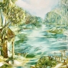 Before us is a picturesque landscape, executed in a light, almost watercolor style with elements of stylization. In the center of the composition is a calm river, stretching into the distance and reflecting the heavenly light in its smooth surface. On both sides of the river are dense tree crowns, painted with soft, slightly blurred strokes, which creates a feeling of lightness, silence and peace.