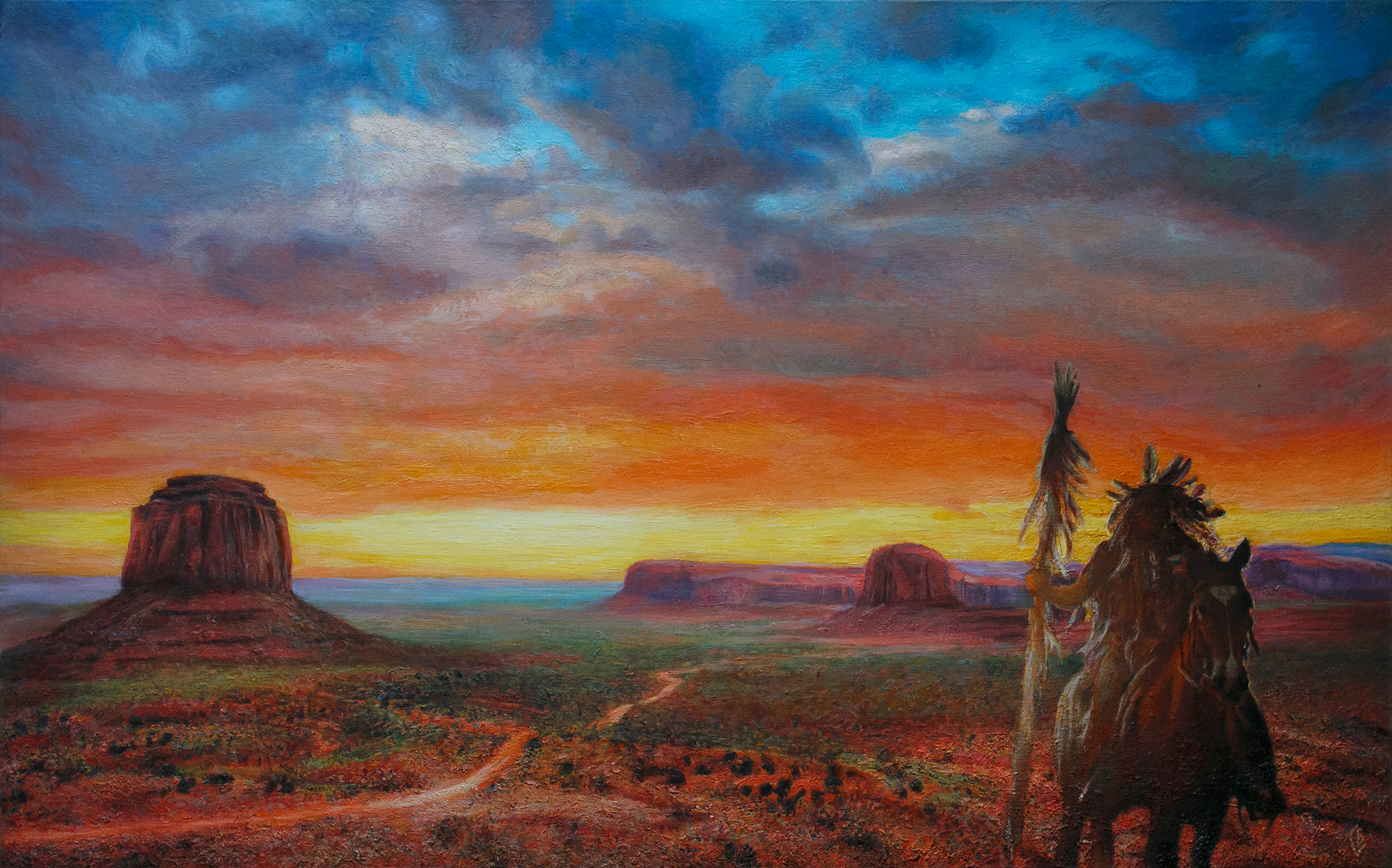 На переднем плане справа художник изобразил человеческую фигуру, возможно, индейца на лошади. Эта фигура придаёт сцене масштабность и ощущение древности, подчёркивая связь человека с этой величественной, суровой землёй.
