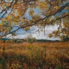 Композиция обрамлена тёмными тяжёлыми ветвями дерева на переднем плане, густо усыпанными жёлто-оранжевой листвой. Эти ветви, нависающие над зрителем, создают ощущение укрытия и фокусируют взгляд на открытом пространстве вдали.