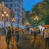 На картине Сергея Бухалева «Вечерний Арбат» запечатлена одна из самых оживлённых пешеходных улиц Москвы в момент, когда город переходит от сумерек к ночи. Художник передаёт атмосферу гуляющего, расслабленного пространства, наполненного светом и движением.