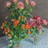 Композиция представляет собой богатую группу срезанных цветов, расположенных в вазах. Основное внимание привлекают розы — в верхней части доминируют крупные бутоны нежно-розового и лососевого оттенков, их лепестки кажутся почти бархатными. Ниже расположены более мелкие ярко-оранжевые цветы, а справа — пышное облако соцветий оттенков фуксии и малины, напоминающее сирень или мелкоцветковые хризантемы.