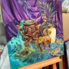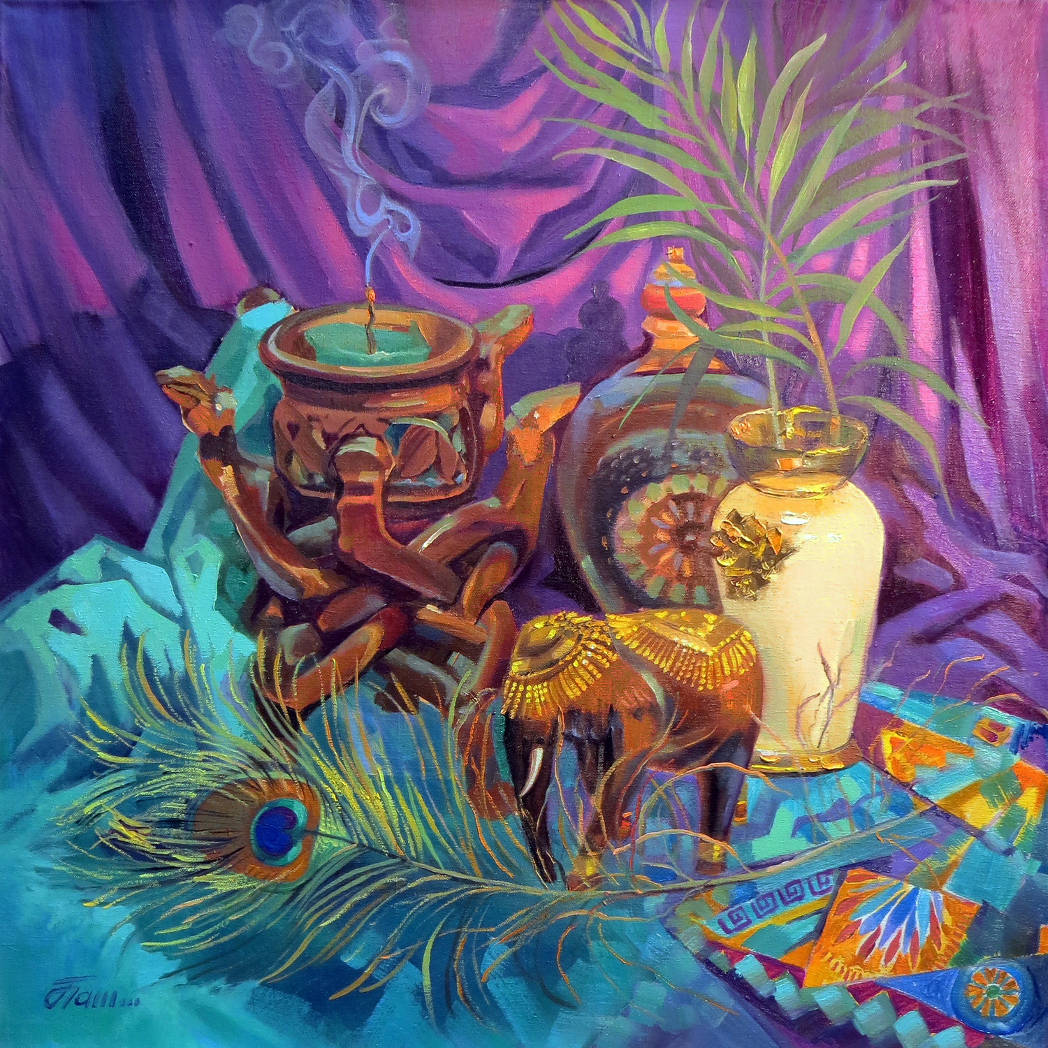 The still life "From Distant Wanderings" is a unique combination of travel memories. It harmoniously combines objects brought from Egypt and Arab countries: an elephant, a palm branch, an ethnic incense stand and a peacock feather. These elements are not only visually attractive, but also carry a special meaning, reminding of the bright moments of travel. The work was created in the artist's studio, where a creative atmosphere reigns. This approach allows you to see and feel the influence of different cultures on art more deeply. Each detail of the still life speaks of personal memories and an emotional connection with these countries, creating a unique story.