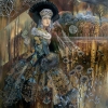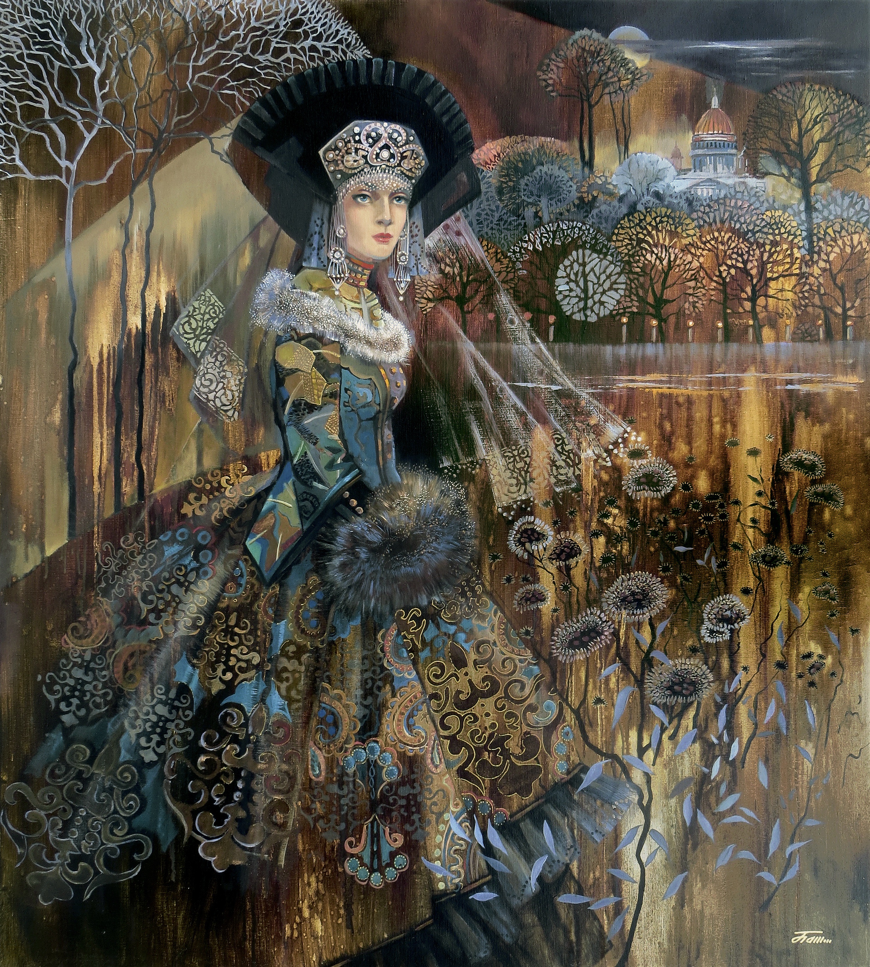 The work uses historical elements, such as the costume and views of St. Isaac's Cathedral. The color scheme is done in the warm tones of pre-winter nature. The style is conventionally decorative, with an emphasis on the black kokoshnik crown, which refers to modern events.