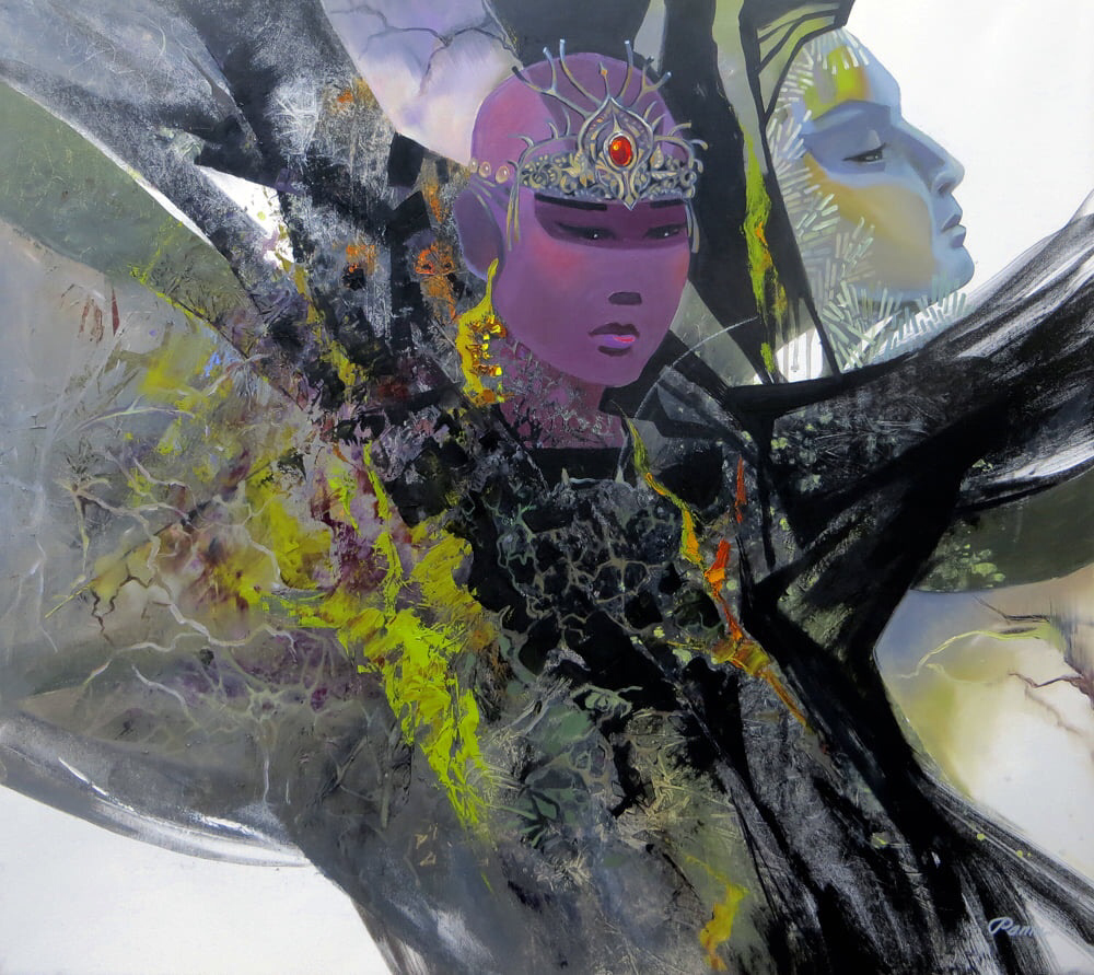 The painting "The Choice of Path" depicts two warriors, each looking in opposite directions. They create a tense atmosphere, reflecting inner conflict and the unpredictability of choice.