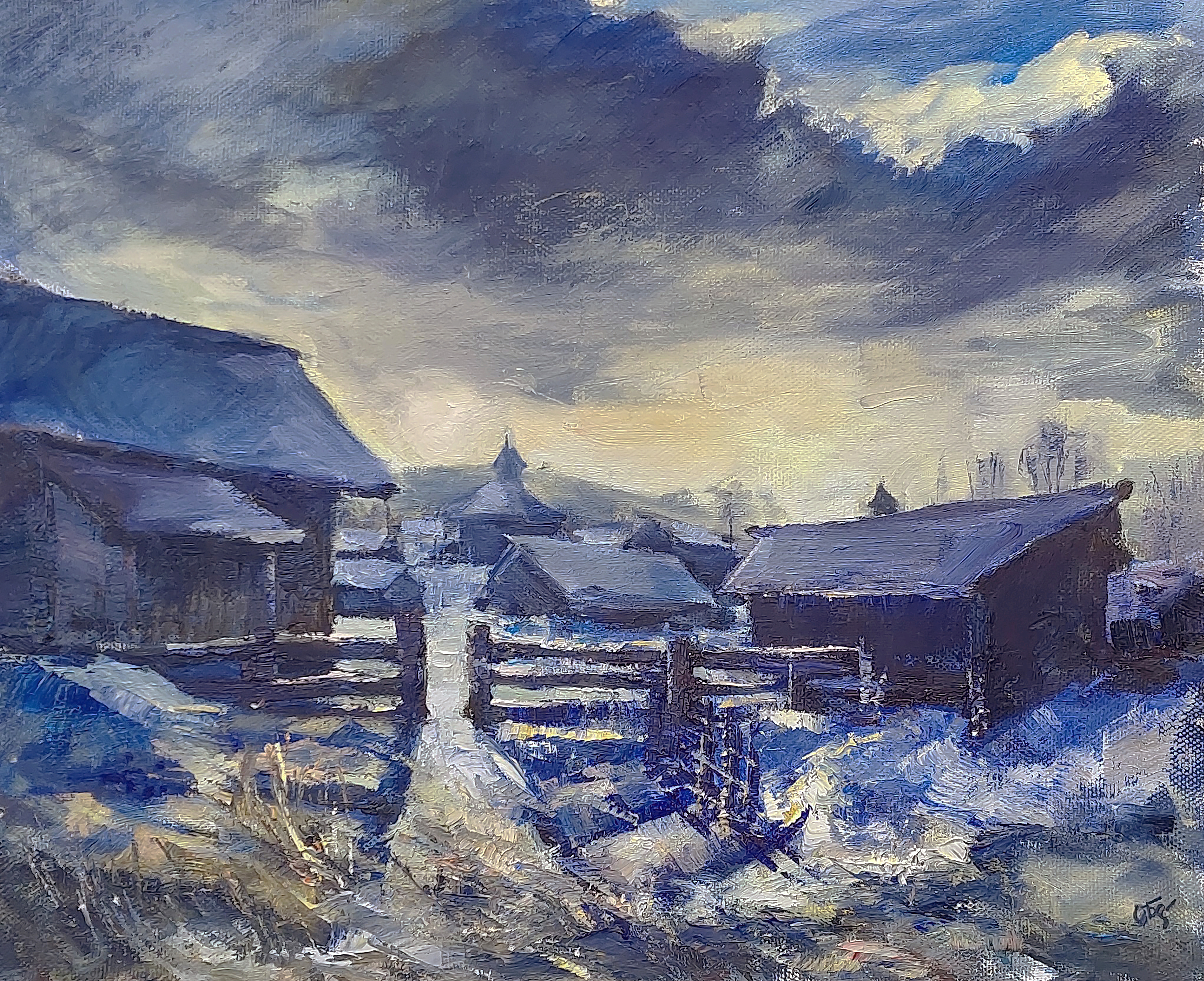 The painting depicts a winter village street at dawn or sunset. The sunlight barely touches the roofs of houses covered with fresh snow, and softly illuminates the snow-covered ground and the dark wooden fence in the foreground. In the distance, silhouettes of wooden buildings and domes, perhaps a church, are visible, dissolving in a light morning mist. The sky is covered with heavy clouds, but golden and blue rays break through them, filling the landscape with a light, slightly cool atmosphere. The painting conveys a sense of peace and comfort of a winter Russian village, lost in time and silence.