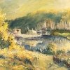 The lyrical landscape reveals the quiet beauty of a river backwater. On the shore, among the golden foliage of the bushes, the reflections of the sun shine, giving the whole plot the glow of early autumn. To the right and left, the bushes and grass glow with yellow and green shades, and in the center, by the water, moored boats are visible, surrounded by a mirror-like surface of water. In the distance is a dense forest with shadows of birch trunks, immersed in a light midday haze. The main emphasis is on the harmony of nature, tranquility and shimmering light, which seems to dissolve the boundaries between the earth, water and sky. The picture sets you up for reflection, gives a feeling of coziness and warmth.