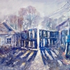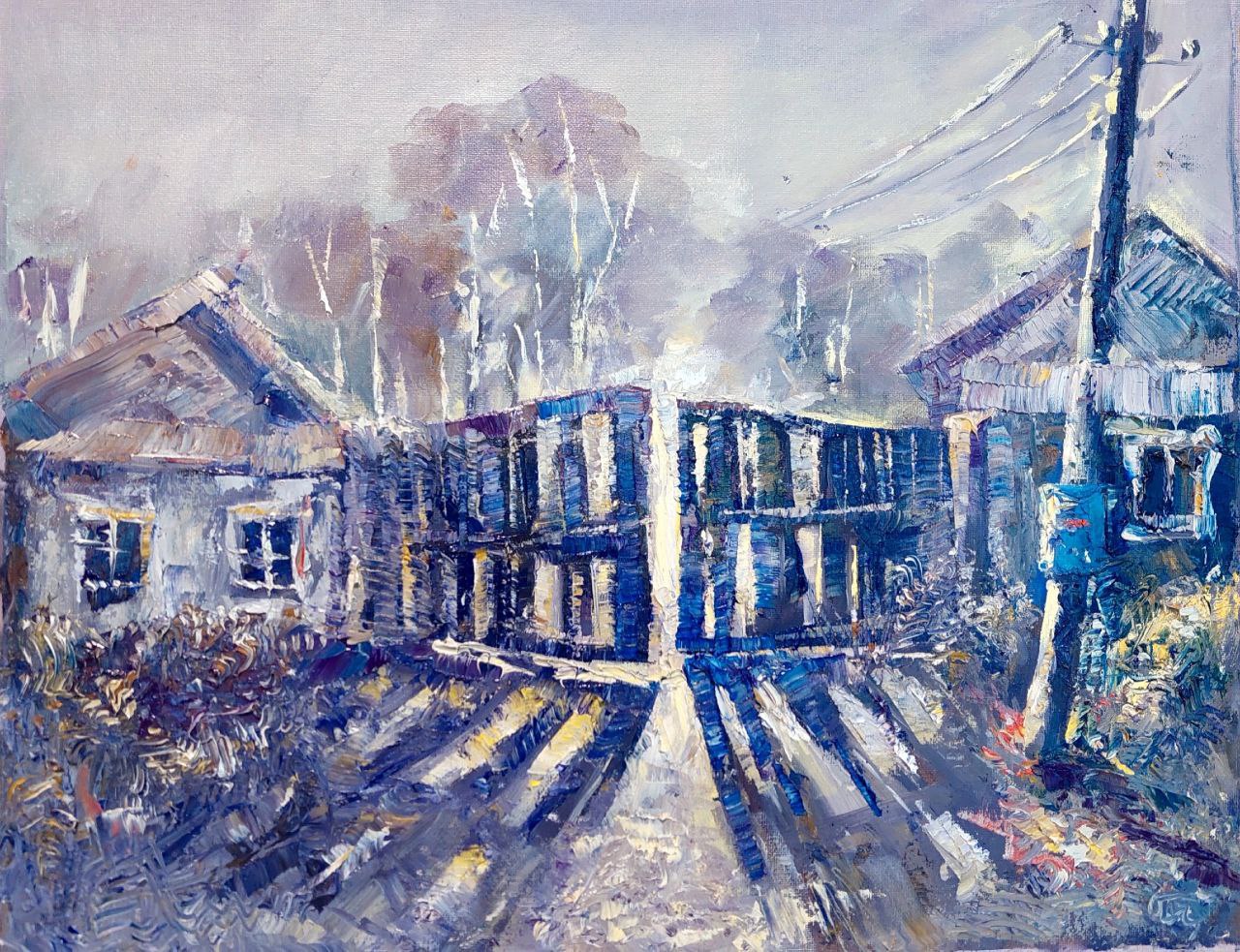 The viewer is presented with the atmosphere of a provincial village in cool gray-blue tones. In the foreground are wide-open old wooden gates, their massive doors casting long shadows on the road leading into the yard. On both sides are dilapidated houses with slanted roofs, windows, and cracked plaster. Electric wires run along the fence, and a pole with a distribution board is visible on the right. The background is shrouded in a mysterious gray fog, in which the silhouettes of trees are hidden. The entire composition seems to be immersed in early morning or the darkness of an autumn evening, when the air is filled with moisture and silence. The painting evokes a feeling of nostalgia and slight sadness for a time gone by.