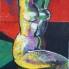 An abstract figure, executed in broad and energetic brushstrokes of yellow, green, violet and black. The dynamics and plasticity of the human body are visible, but the forms are deliberately distorted, the contours are emphasized by the contrast with the bright red and black background. The work evokes associations with modern sculpture or Cubist art.