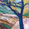 The central place in the painting is occupied by a tree with a powerful blue trunk, stretching its branches in different directions. It acts as a symbol of strength and life against the background of an abstract landscape, made in pastel and bright shades of green, yellow, blue and white. The brushstrokes are bold and energetic, creating a sense of movement and wind. The lines of the landscape twist, as if emphasizing the dynamics of nature. The work is filled with a feeling of spring or early autumn, conveying the harmony between man and the surrounding space.
