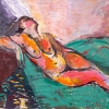The abstract female figure is positioned in a reclining pose on a green surface that resembles grass or a blanket. Her body is painted with rich pink, orange and yellow brushstrokes, emphasizing the warmth and sensuality of the image. The lines are dynamic but not clear, which creates a feeling of lightness and naturalness. The background of the painting is abstract, with shades of purple and pastel pink, which adds softness and depth to the composition. The work conveys a sense of peace and harmony, emphasizing natural beauty and connection with the surrounding world.