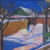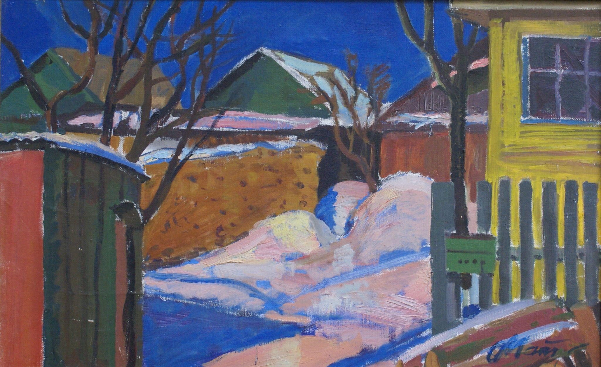 This canvas depicts a typical corner of a Russian village in winter. In the foreground on the right, you can see the wall of a yellow house with a window, a green mailbox, and a wooden fence. In the yard, snowdrifts rise, on which lies the pink and blue reflection of the sunset or morning sky. Behind the fence, village houses with typical green roofs are lined up in a row, behind which rises a dense wall of dry straw or a fence. Black leafless tree branches stretch toward the deep blue sky, enhancing the feeling of winter cold and peace. The atmosphere of the painting is filled with a sense of coziness, home warmth, and village silence, emphasized by the purity of the snow cover.