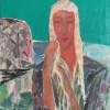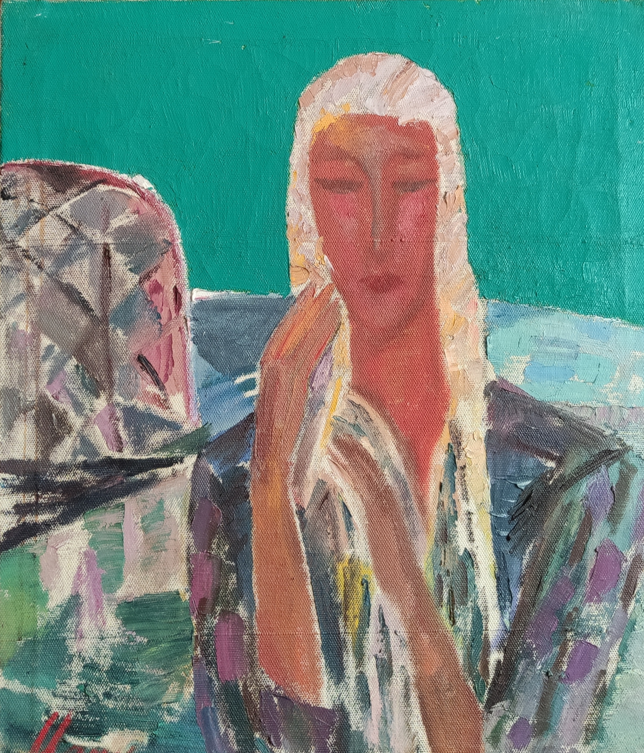 Portrait of a woman in the style of expressionism. The figure is distinguished by elongated proportions, closed eyes and a thoughtful expression. The background is bright green, making the figure stand out and seem immersed in her own inner world. Abstract forms in the background may symbolize the environment or memories.