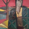 The canvas depicts a man in an unusual geometric style. The character's gaze is directed to the side, the facial features are emphasized schematically and laconically, which adds a certain detachment and thoughtfulness to the image. Large planes of red, yellow and green in the background are reminiscent of sunset or sunrise, and the bare branches of the tree create a feeling of autumn or early spring. Particular attention is drawn to the complex pattern or seams on the dark jacket - they are made with clear lines and a contrasting color, which adds character to the figure. The painting seems to combine tradition and modernism, and the calmness and mystery of the look leave the viewer room for imagination about the inner world of the character.