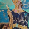 A light, modern image of a young woman looking thoughtfully at her phone. Her face and body are made up of different color planes - pink, beige, yellow and blue, which gives the portrait an expressive mosaic quality. In the background, you can guess a seascape with a sailboat or yacht, made abstractly, with blue and turquoise strokes. The girl is dressed in a loose dark blouse with an abstract pattern. She seems to be detached from the outside world, her attention is occupied only by the screen, which emphasizes the theme of detachment and immersion in the digital reality of a modern person. The composition conveys subtle psychologism, mixes a traditional portrait and modern content.