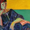 The woman in the portrait is in a relaxed pose, leaning on her hand. Her clothes are blue and purple, and her facial features are emphasized by sharp lines. The background of the painting is a bright and laconic composition of rich yellow and green colors, which set the mood of warmth and emphasize the central figure. The slight grotesqueness of the proportions and the expressiveness of the brushstrokes give the work a special energy and drama. However, the woman's facial expression is calm and slightly thoughtful.