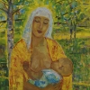 The canvas depicts a woman in a yellow robe and white headscarf, holding a baby to her chest. The composition is done in warm green and yellow tones, creating the feeling of a sunny summer day in a garden or forest. Her face is calm, spiritual, full of love and care. Behind the woman, light, abstractly painted birches appear, adding a Russian national coloring to the scene. This painting is a hymn to motherhood and calm happiness, filled with light, tenderness and eternal human values.